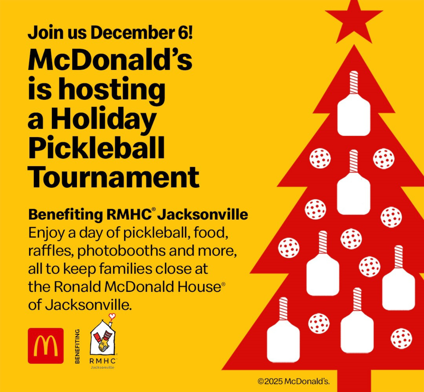 To kick off the holiday season, local McDonald’s Owner/Operators of South Georgia and North Florida would like to invite you to a Holiday Pickleball Tournament, benefiting Ronald McDonald House Jacksonville.